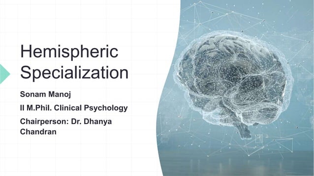 Hemispheric Specialization Goals Explore historical concepts of cerebral dominance and asymmetries in brain anatomy. Understand psychological and experimental studies of lateralization, including visual field and dichotic listening tasks. Examine motor control differences between hemispheres. Investigate unilateral brain damage and split-brain cases. Discuss the "Interpreter" concept and Hemispheric specialization of the human brain is a characteristic feature of functional cortical organization (1). Morphological, functional, metabolic and connectivity asymmetries of brain regions were traditionally correlated to optimal information processing, language function, visuospatial task, attention, and many aspects of emotion (2). How can we get a handle on the functional relevance of hemispheric specialization in humans? One opportunity is to study patients with circumscribed brain lesions in cognitive key regions. The anterior inferior parietal lobule is particularly pregnant to reveal new insights in brain lateralization.